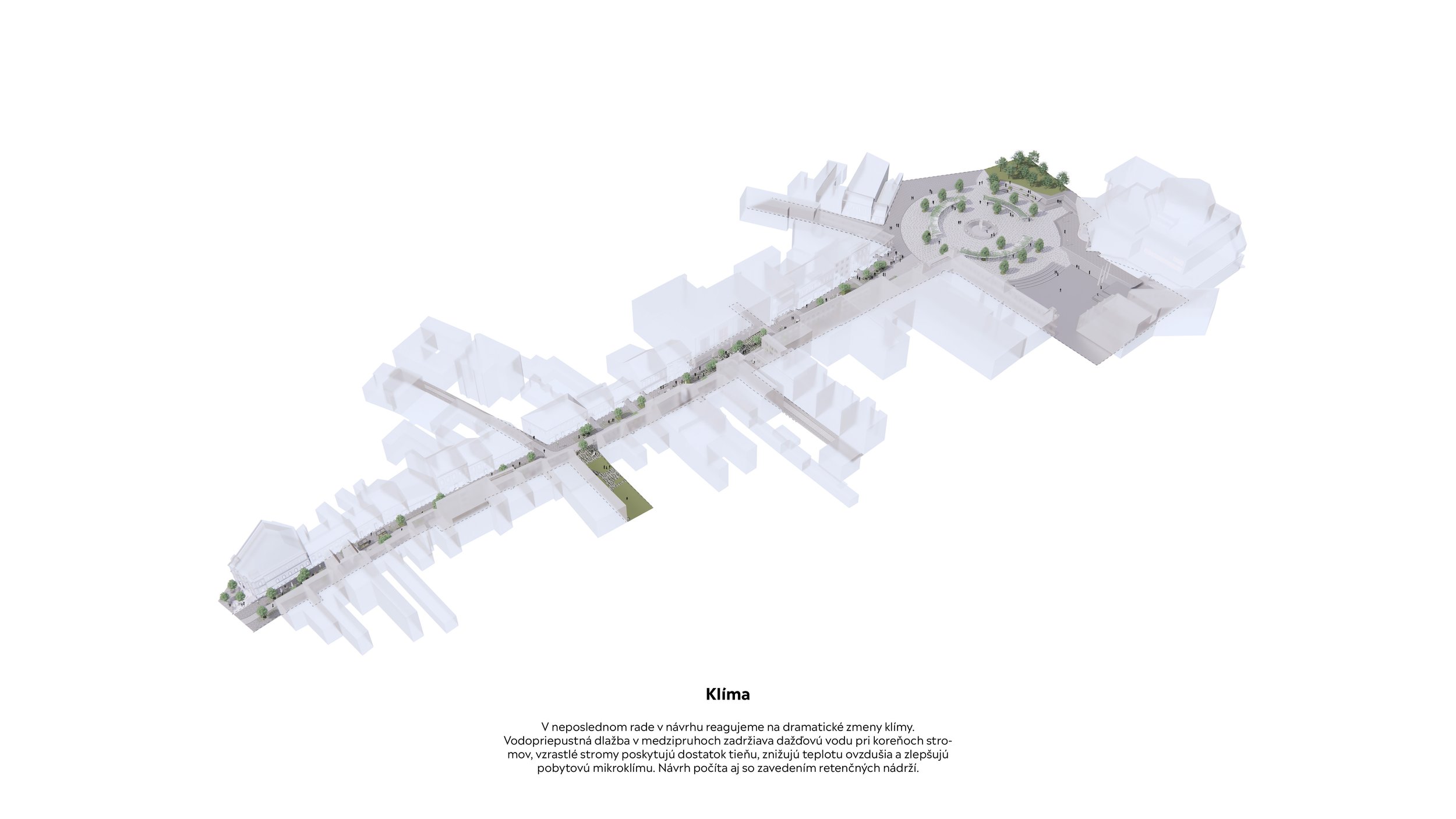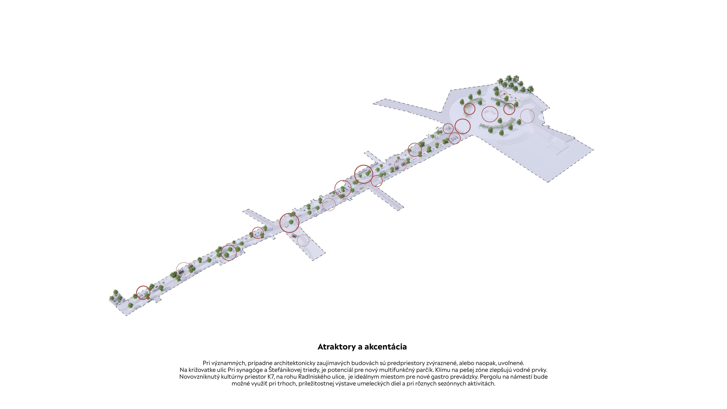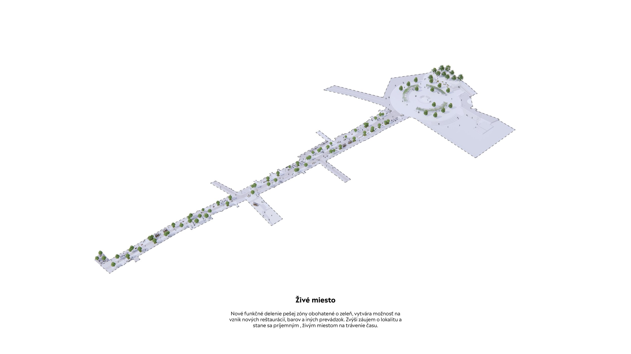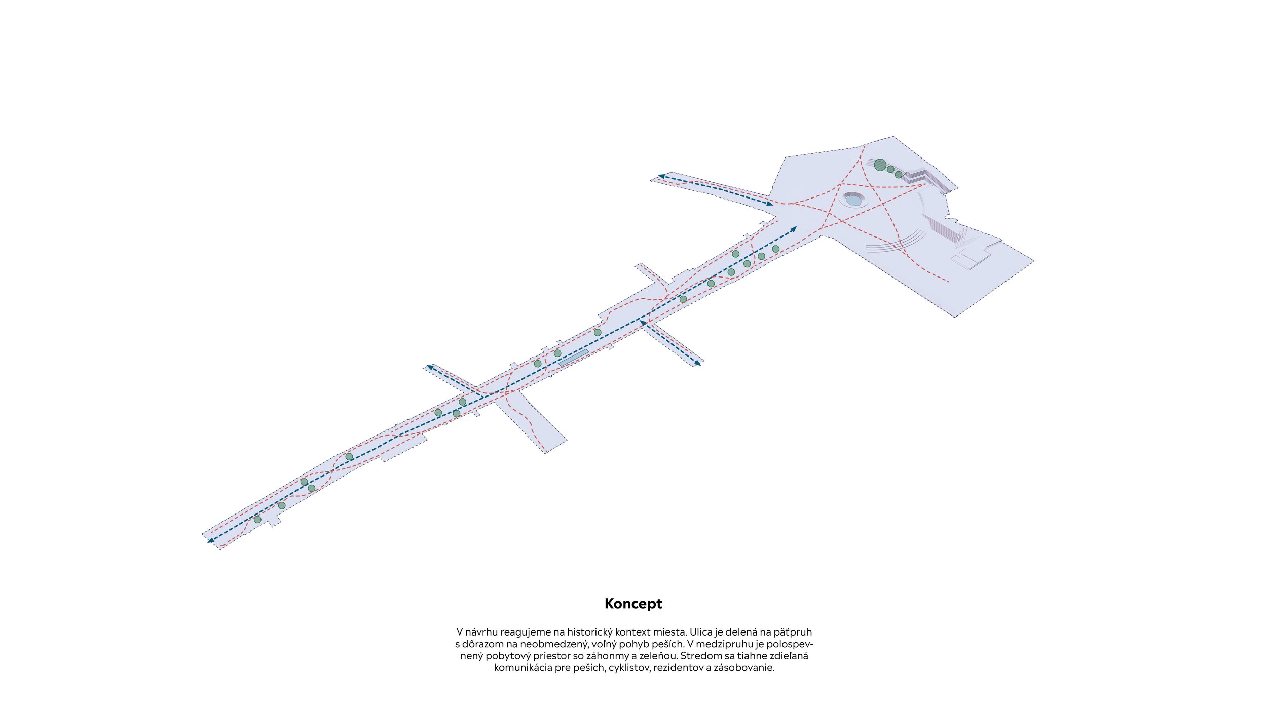 V návrhu reagujeme na historický kontext miesta. Ulica je delená na päťpruh s dôrazom na neobmedzený, voľný pohyb peších. V medzipruhu je polospevnený pobytový priestor so záhonmi a zeleňou. Stredom sa tiahne zdieľaná komunikácia pre peších, cyklistov, rezidentov a zásobovanie.