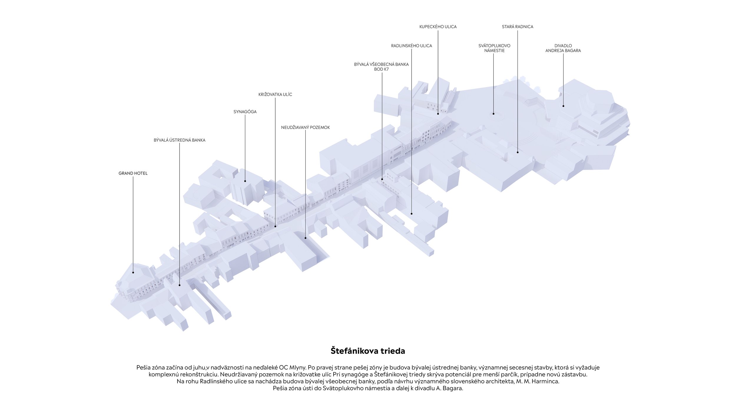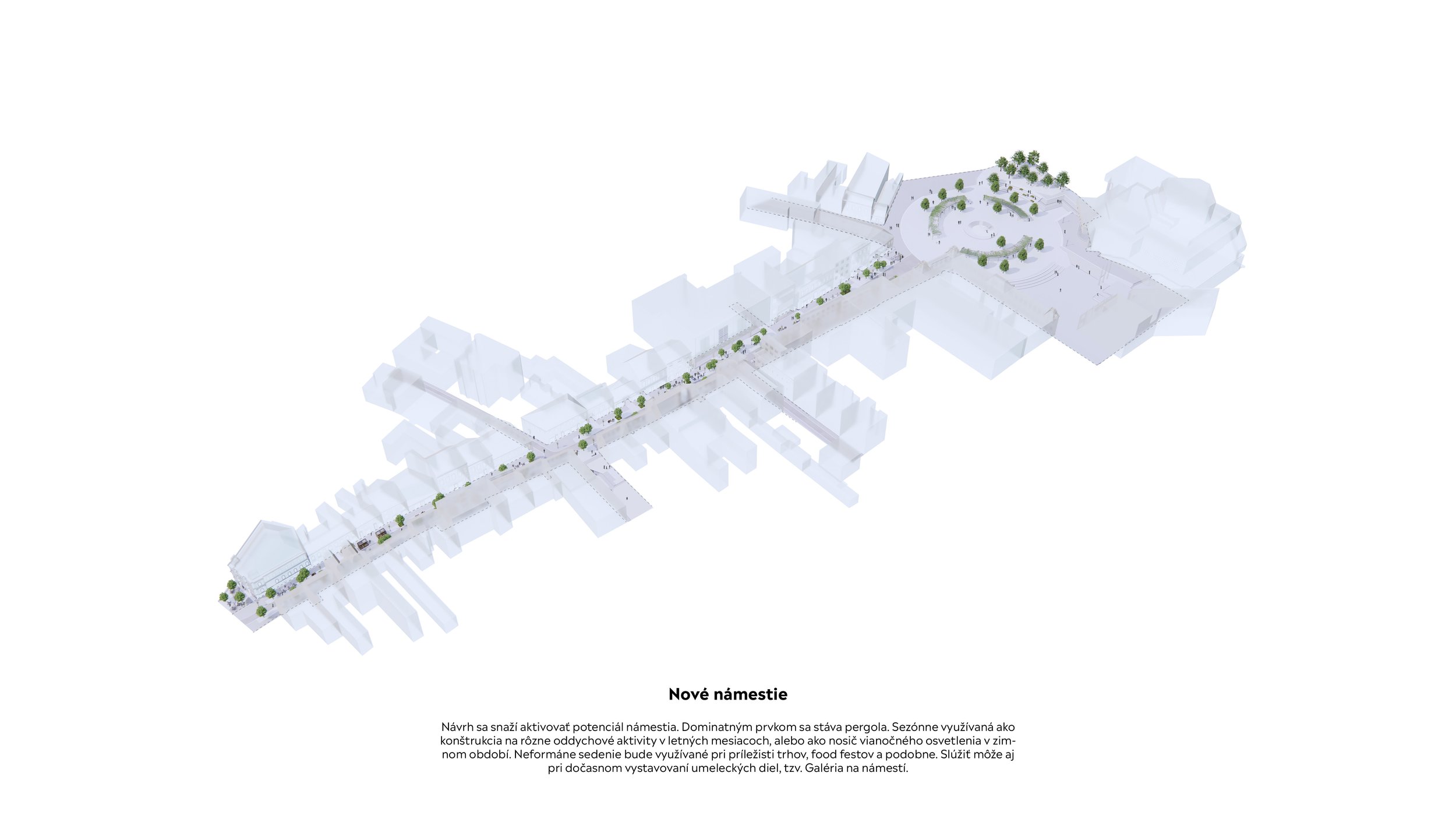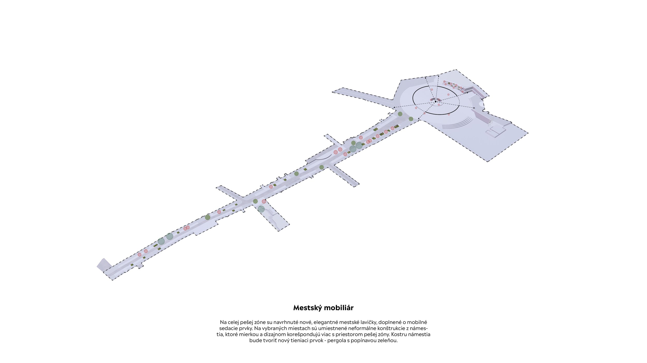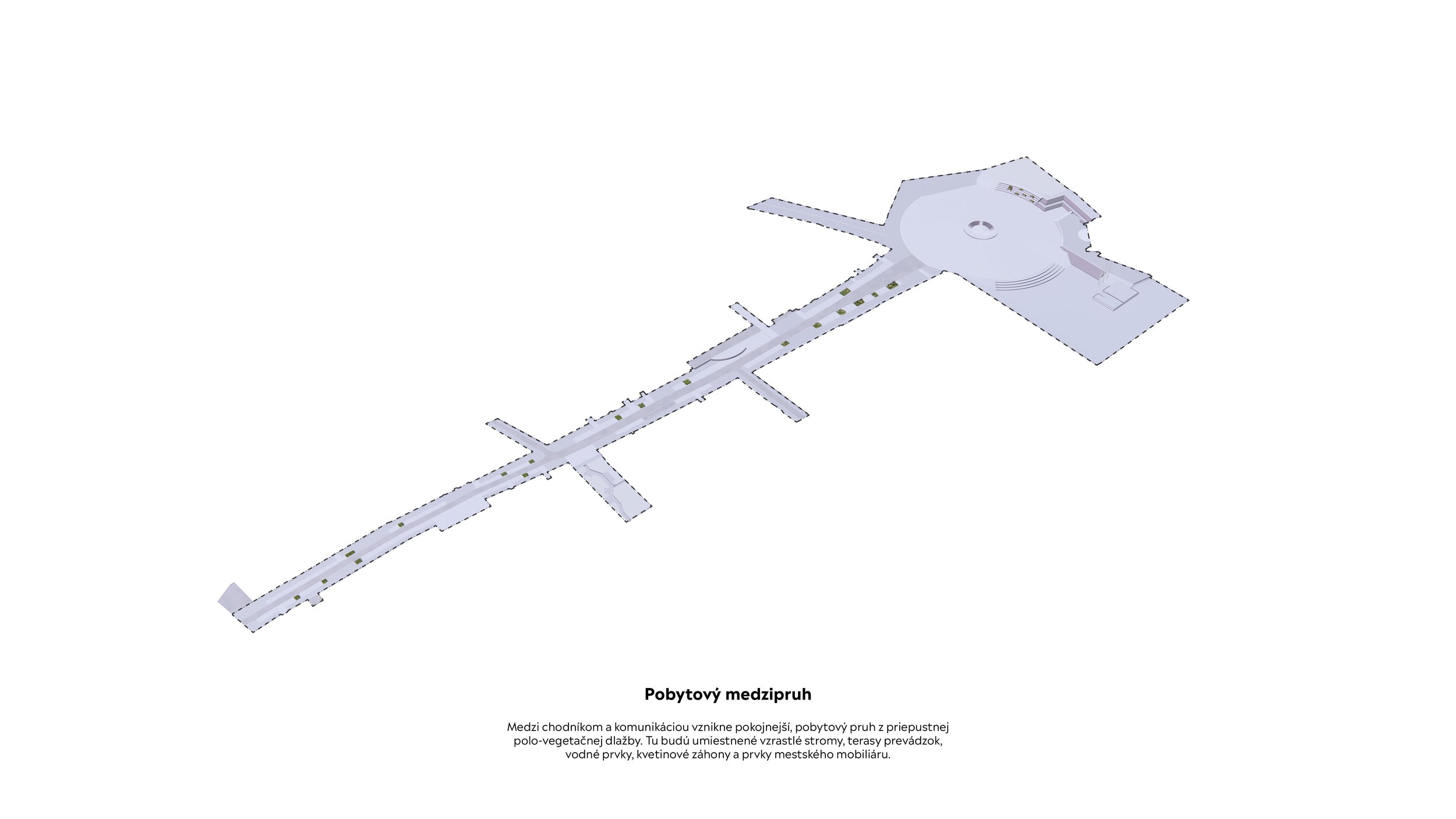V návrhu reagujeme na historický kontext miesta. Ulica je delená na päťpruh s dôrazom na neobmedzený, voľný pohyb peších. V medzipruhu je polospevnený pobytový priestor so záhonmi a zeleňou. Stredom sa tiahne zdieľaná komunikácia pre peších, cyklistov, rezidentov a zásobovanie.
