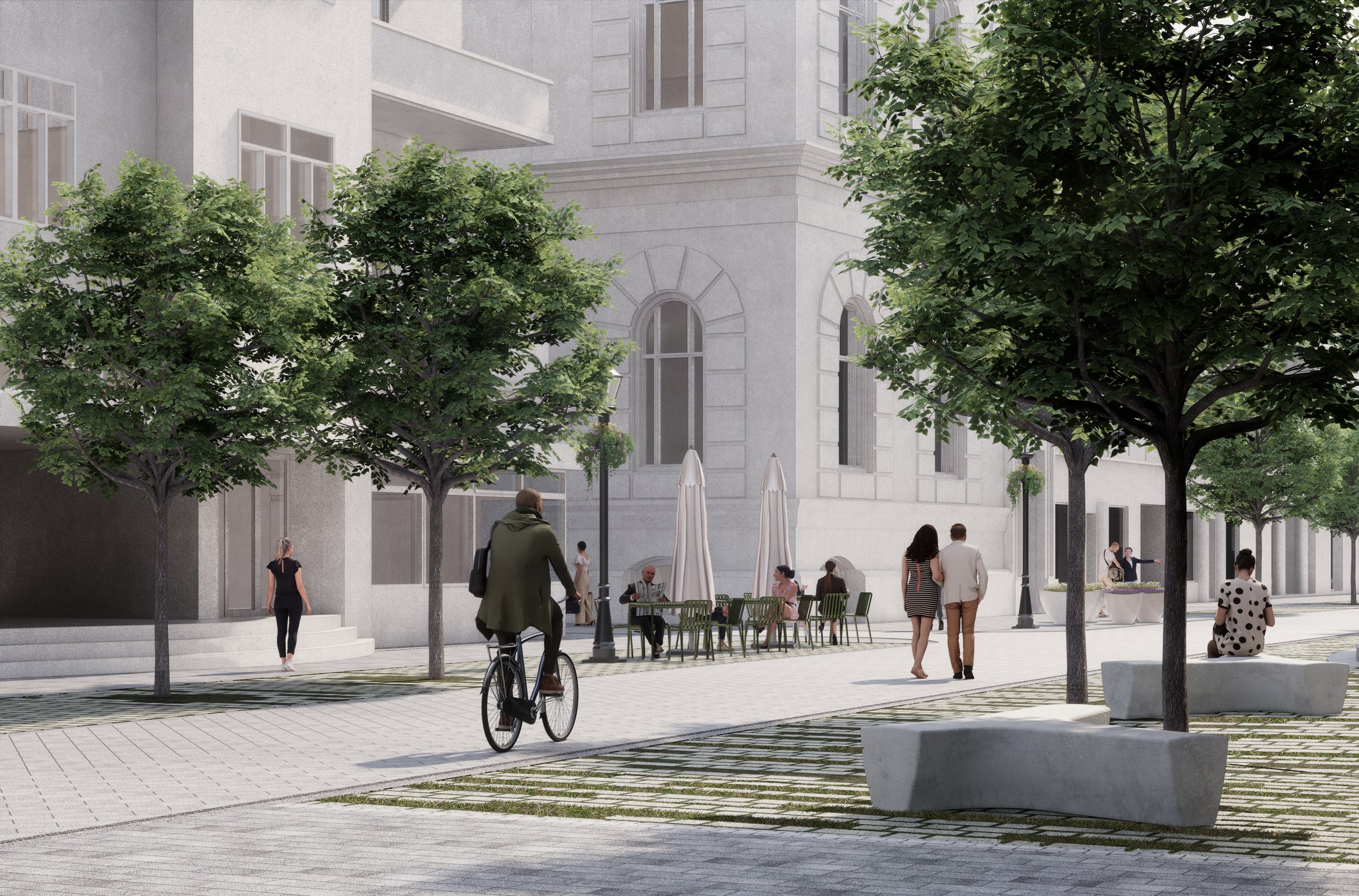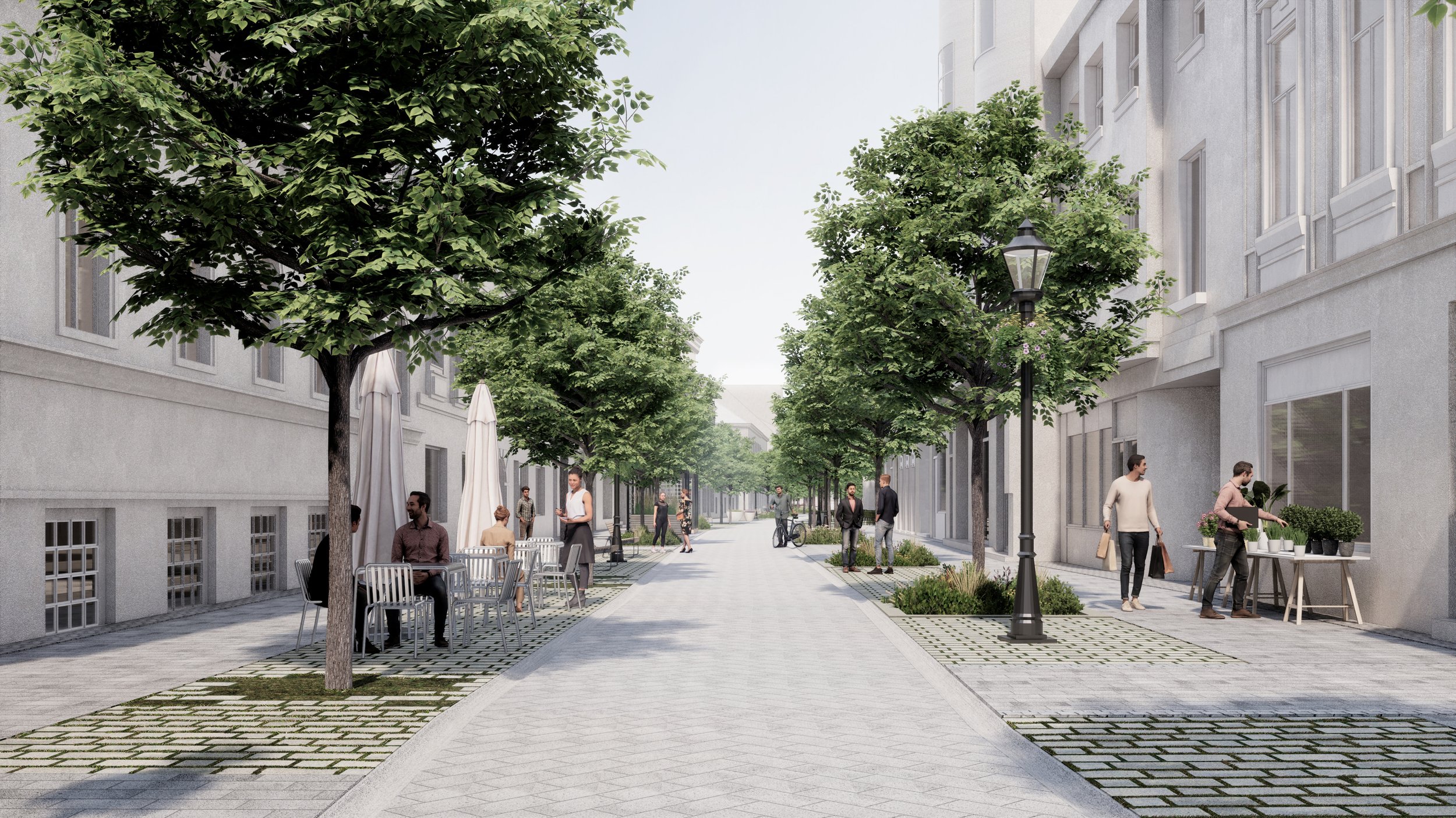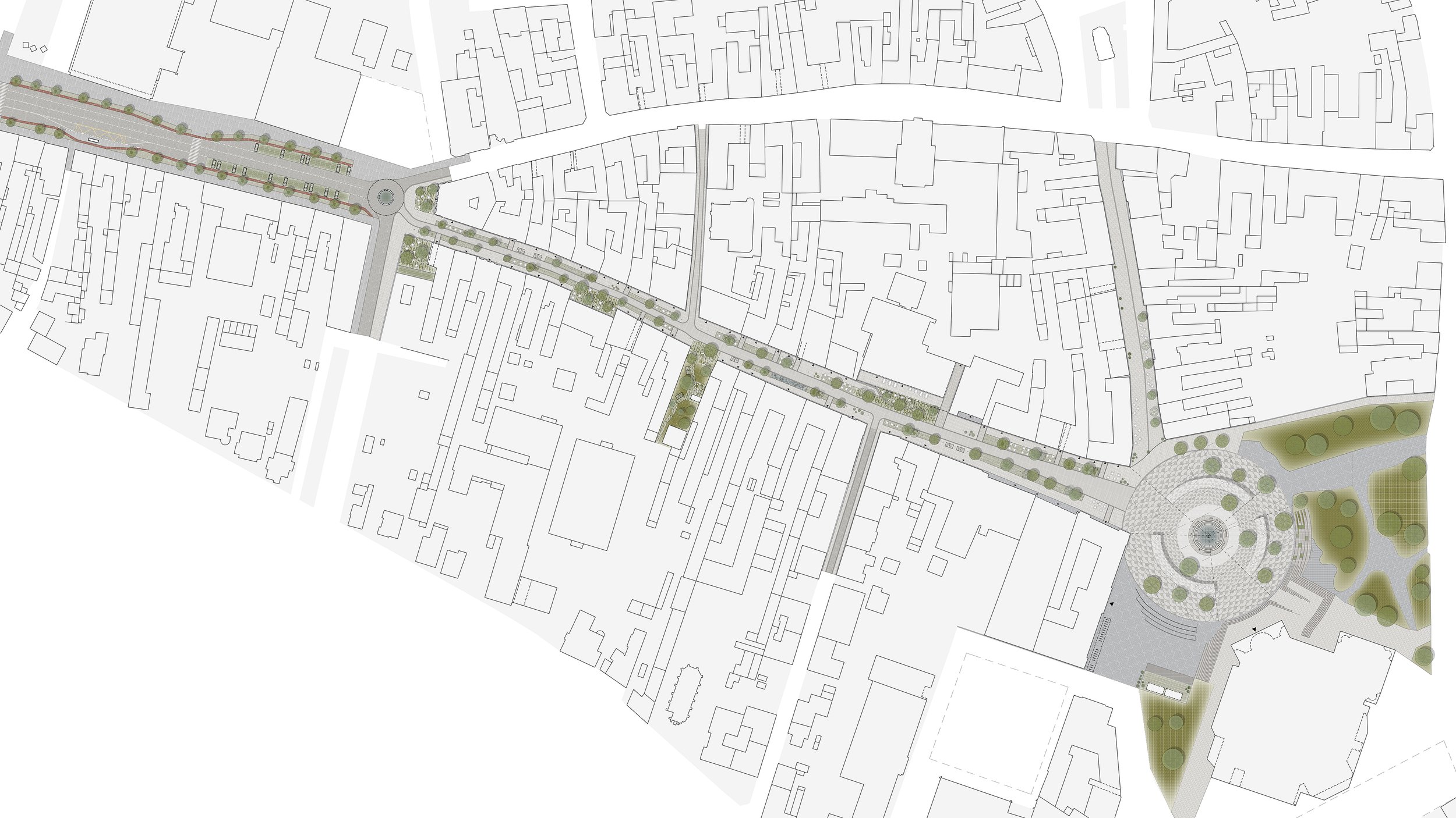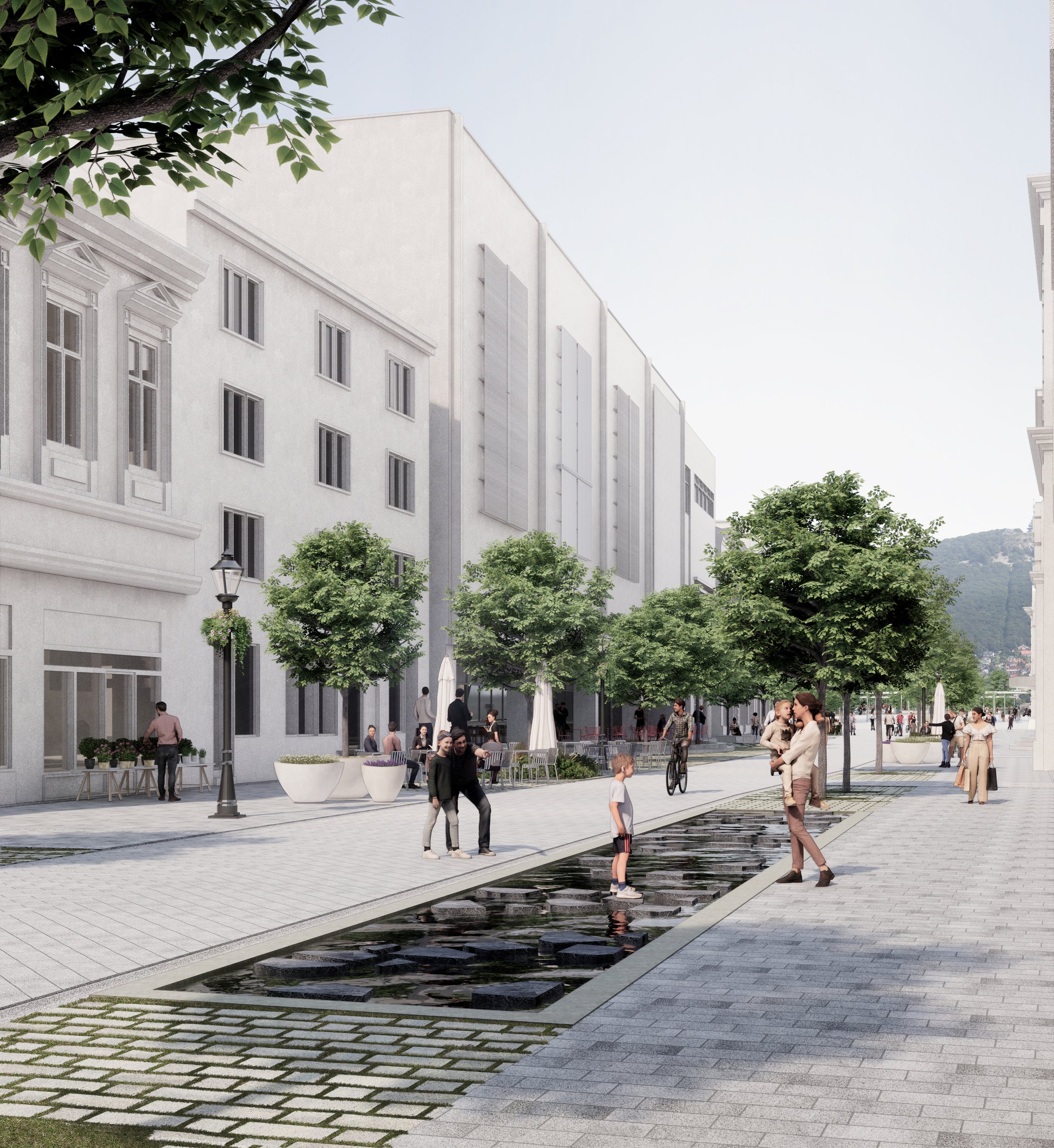 V návrhu reagujeme na historický kontext miesta. Ulica je delená na päťpruh s dôrazom na neobmedzený, voľný pohyb peších. V medzipruhu je polospevnený pobytový priestor so záhonmi a zeleňou. Stredom sa tiahne zdieľaná komunikácia pre peších, cyklistov, rezidentov a zásobovanie.