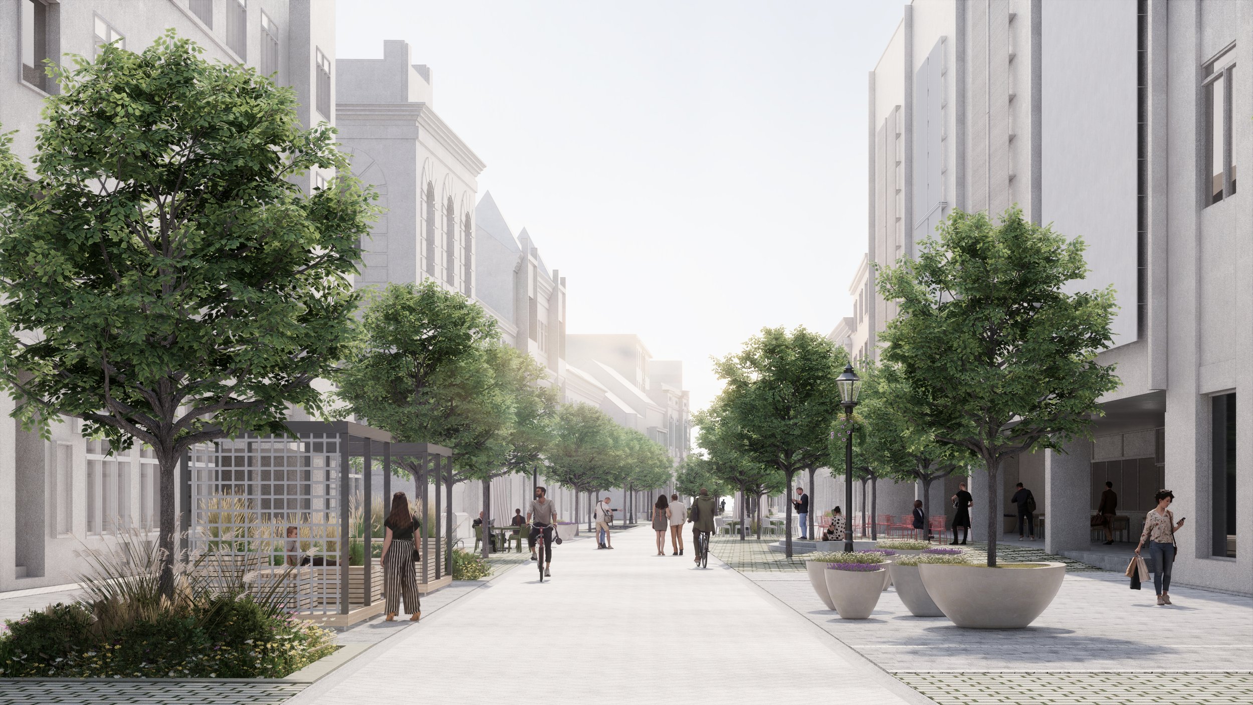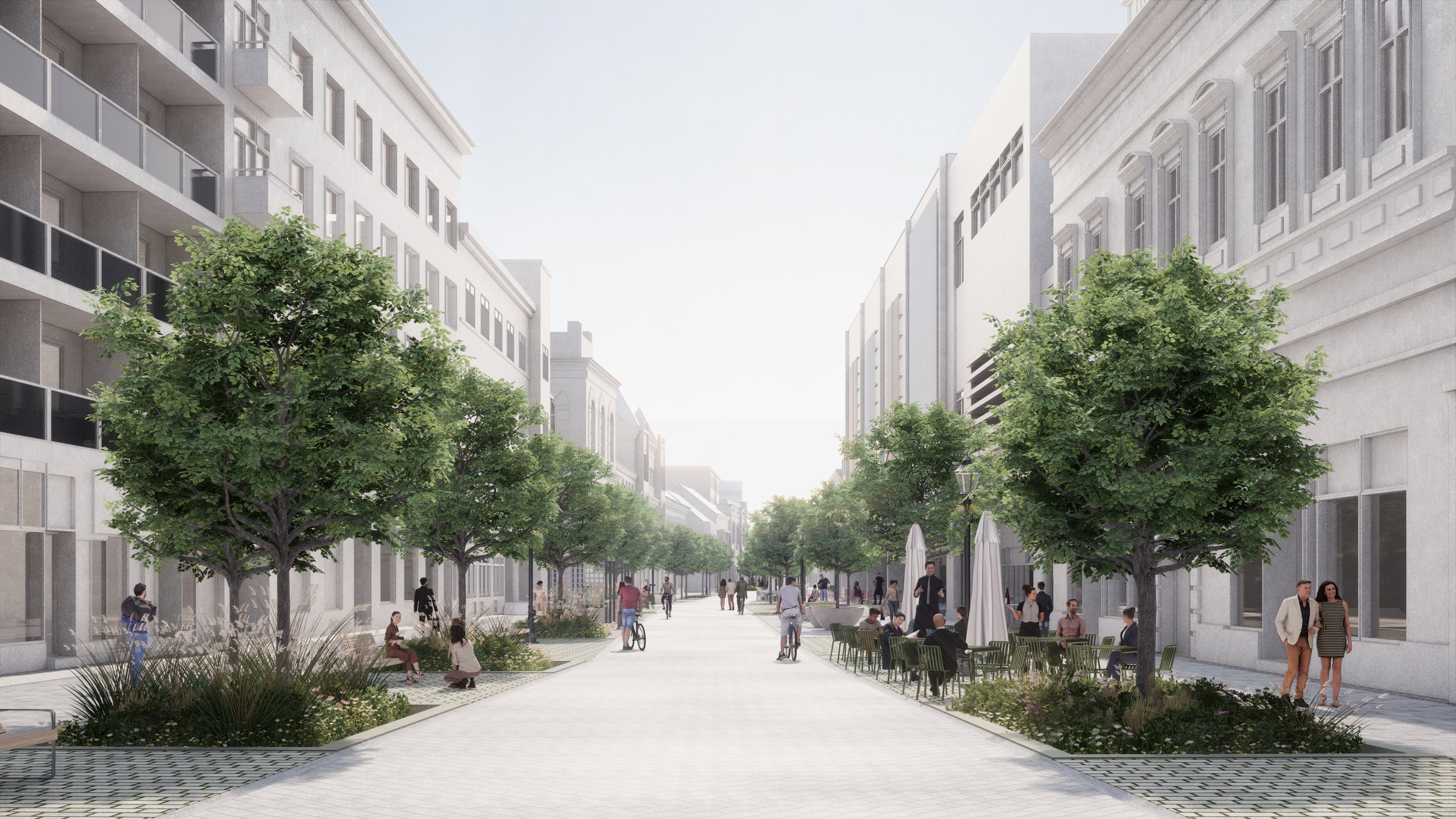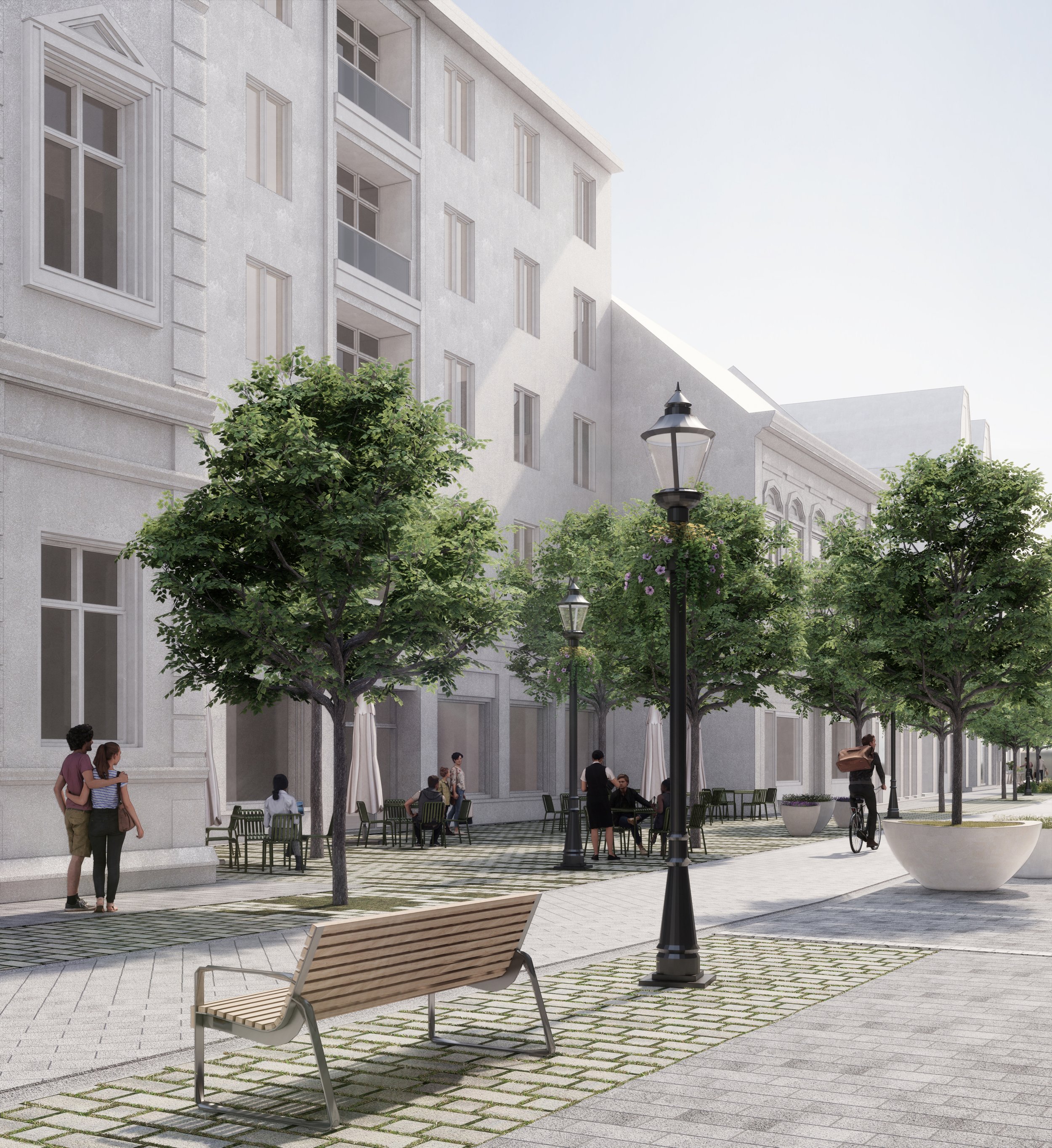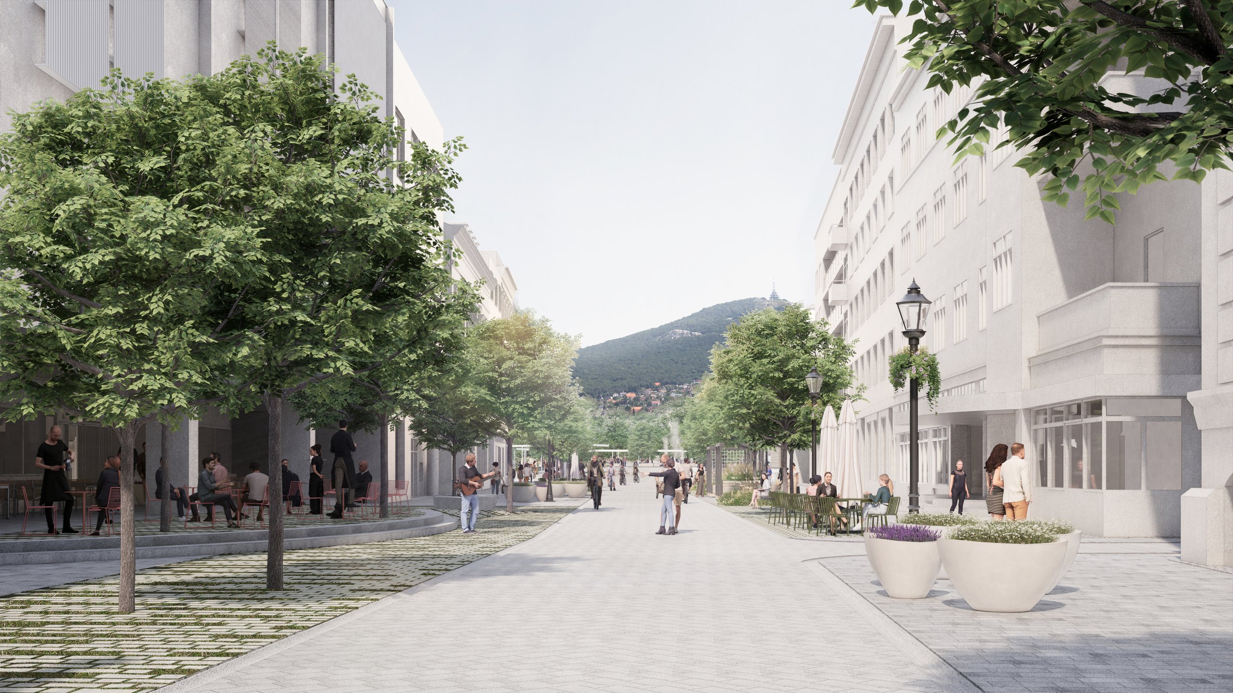 V návrhu reagujeme na historický kontext miesta. Ulica je delená na päťpruh s dôrazom na neobmedzený, voľný pohyb peších. V medzipruhu je polospevnený pobytový priestor so záhonmi a zeleňou. Stredom sa tiahne zdieľaná komunikácia pre peších, cyklistov, rezidentov a zásobovanie.