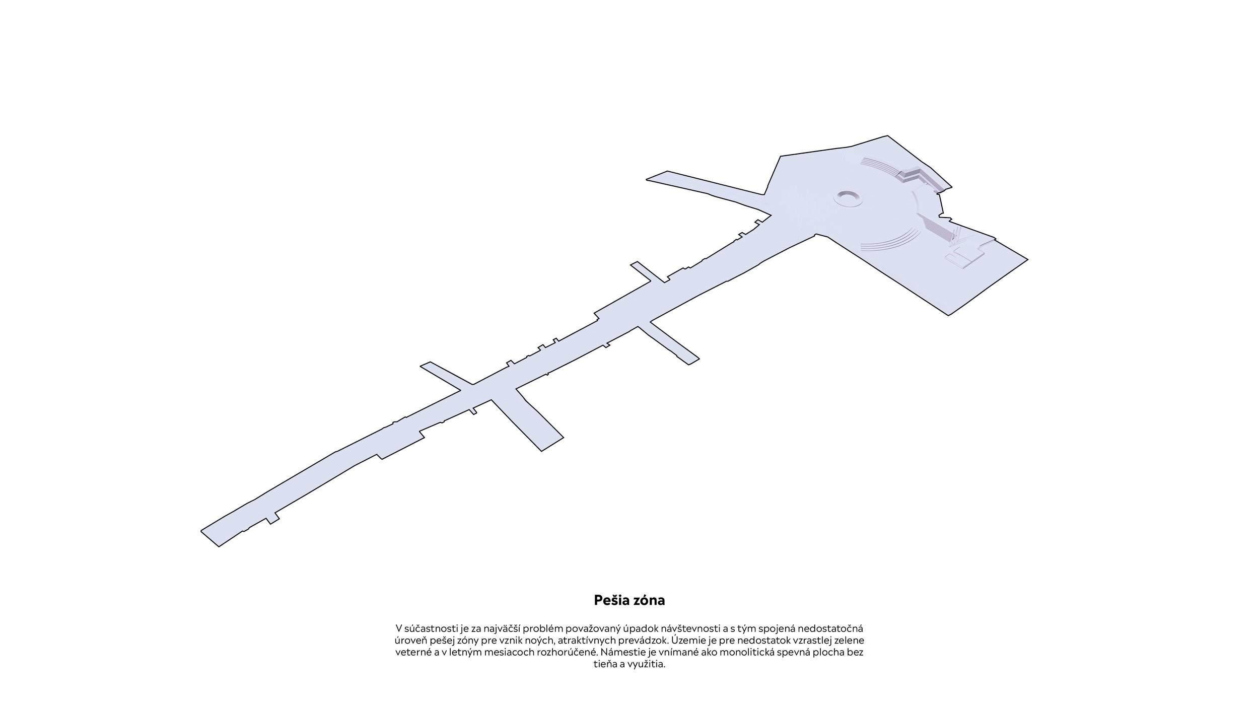 Tento dôležitý verejný priestor je dlhodobo považovaný za mŕtvy a roky sa volá po jeho architektonickom, aj funkčnom oživení. S úpadkom pešej zóny priamo súvisí absencia zelene, verejného mobiliáru a zlá kvalita povrchov.