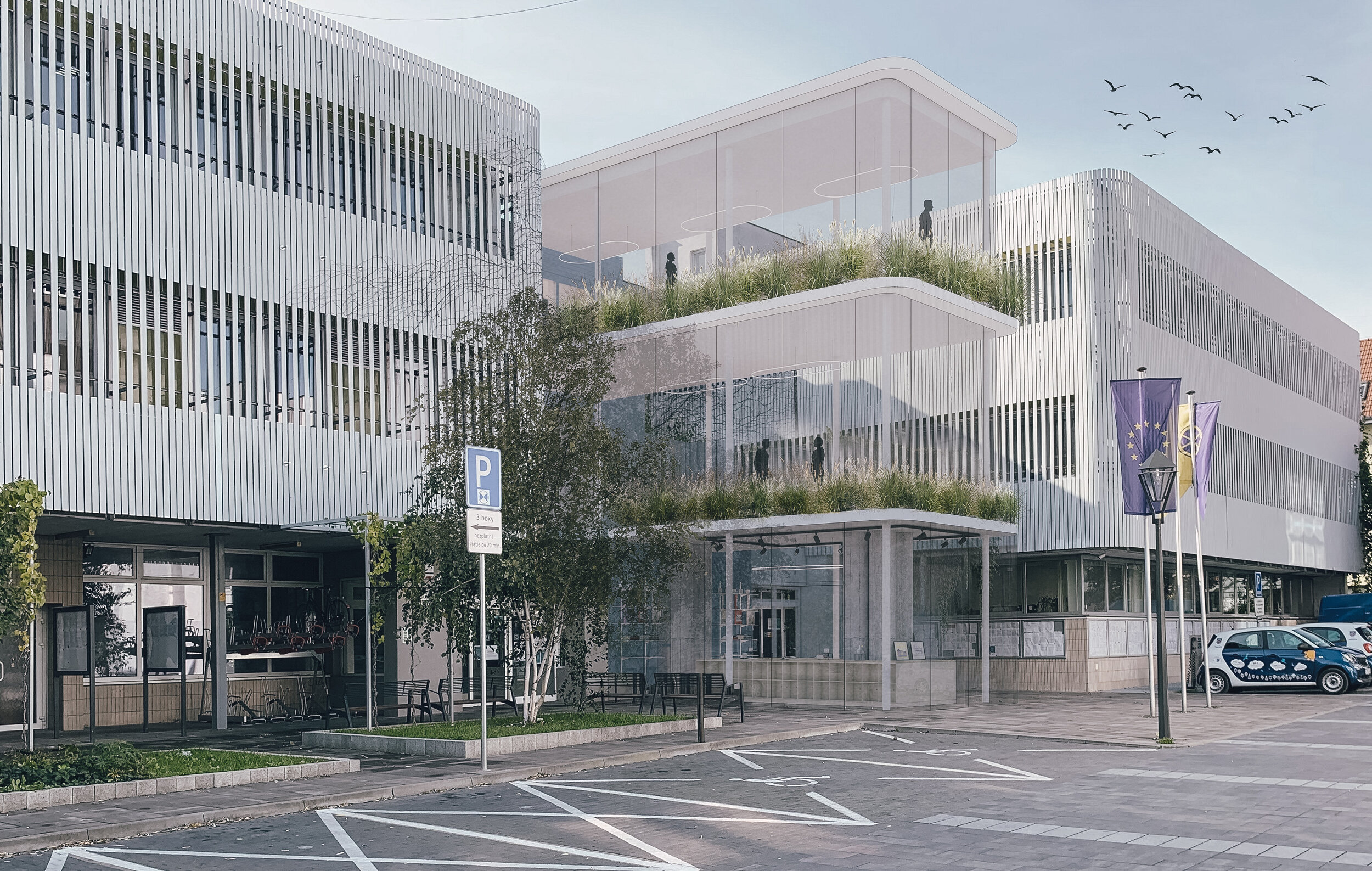 Tvar prístavby vychádza z charakteristickej, predsadenej fasády mestského úradu. Zaoblené nárožia plynule opticky nadväzujú na existujúcu budovu.