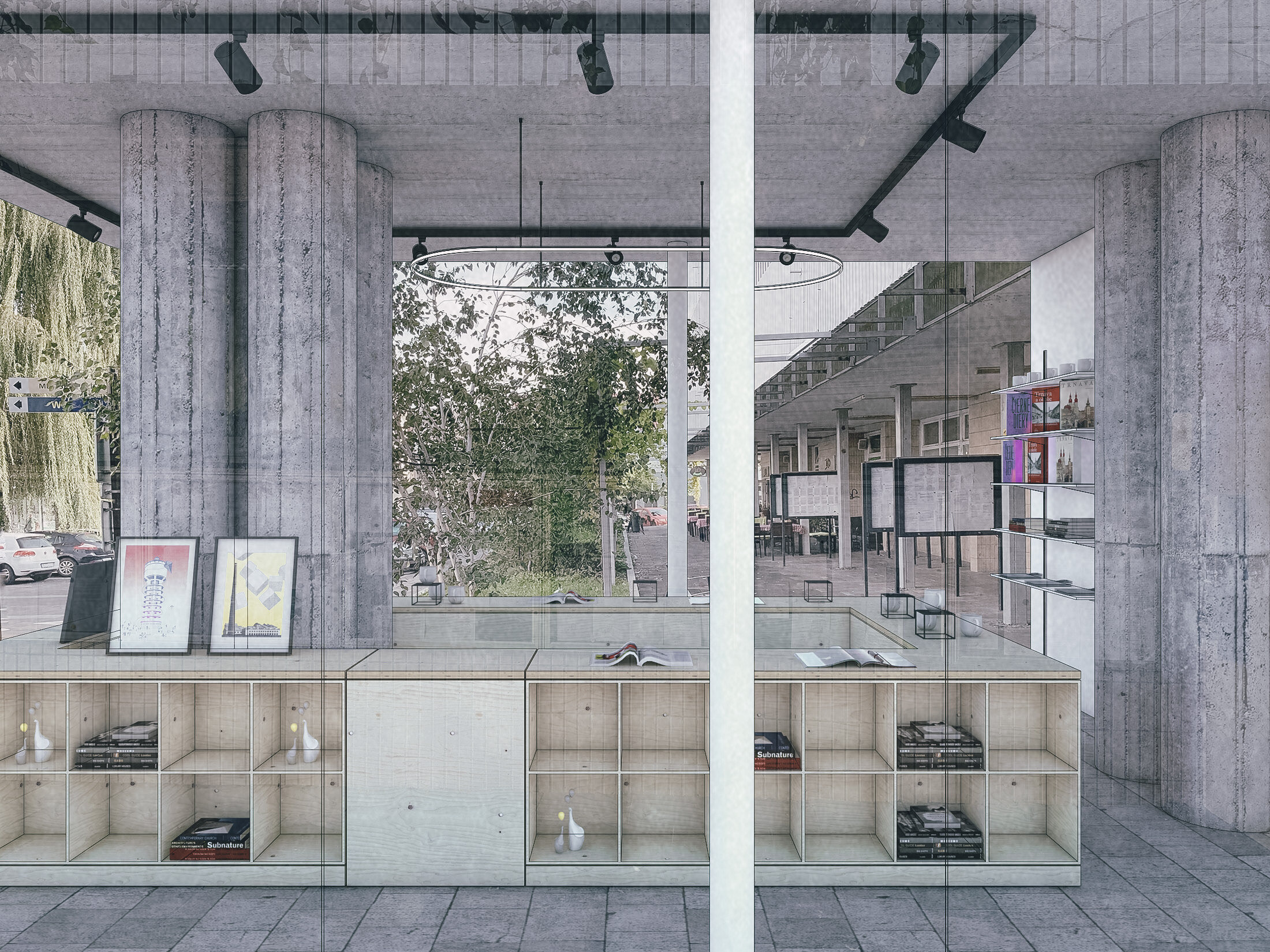 Na 1. NP sa nachádza oficiálna predajňa mesta. Má ponúkať široký sortiment suvenírov, keramiky, textílií, kníh a publikácií o Trnave. V ideálnom prípade od lokálnych výrobcov. Okolo masívneho betónového sústĺpia je priestor na výstavu obrazov a grafík .