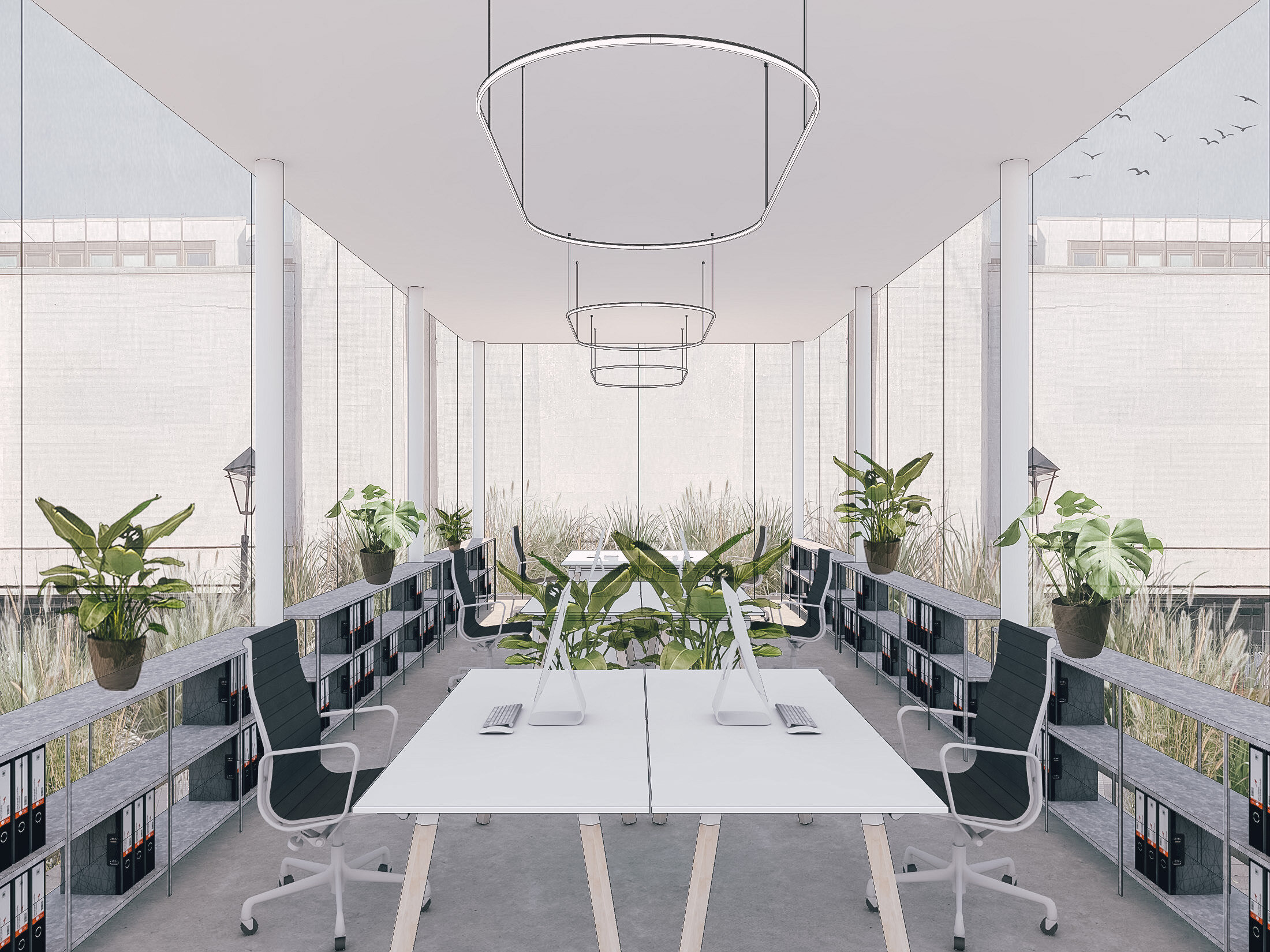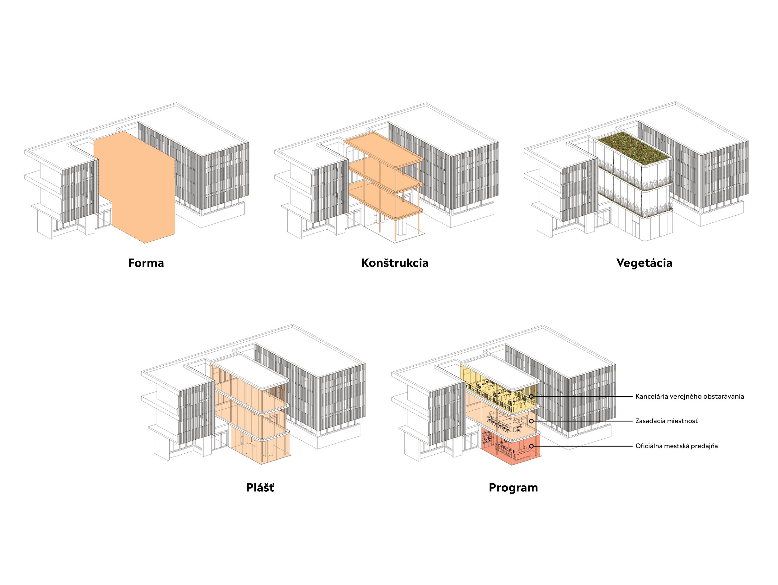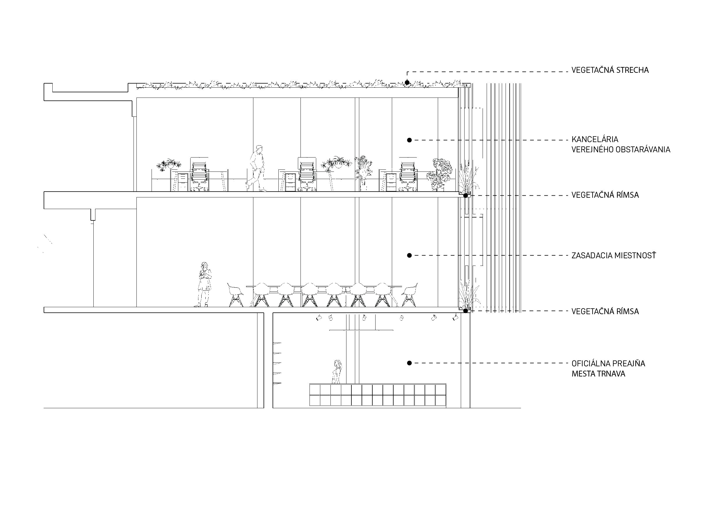Ideový koncept rieši prístavbu k mestskému úradu v Trnave. Má slúžiť ako prvotný krok k otvoreniu diskusie, pomôcť ujasniť predstavu mestských zastupiteľov a overiť realizovateľnosť projektu. Nakoľko nie je možné zo statického posudku riešiť rozšírenie MÚ ako nadstavbu, ponúka sa možnosť obstavať jestvujúcu železobetónovú predsadenú konštrukciu, v súčasnosti využívanú ako terasu.