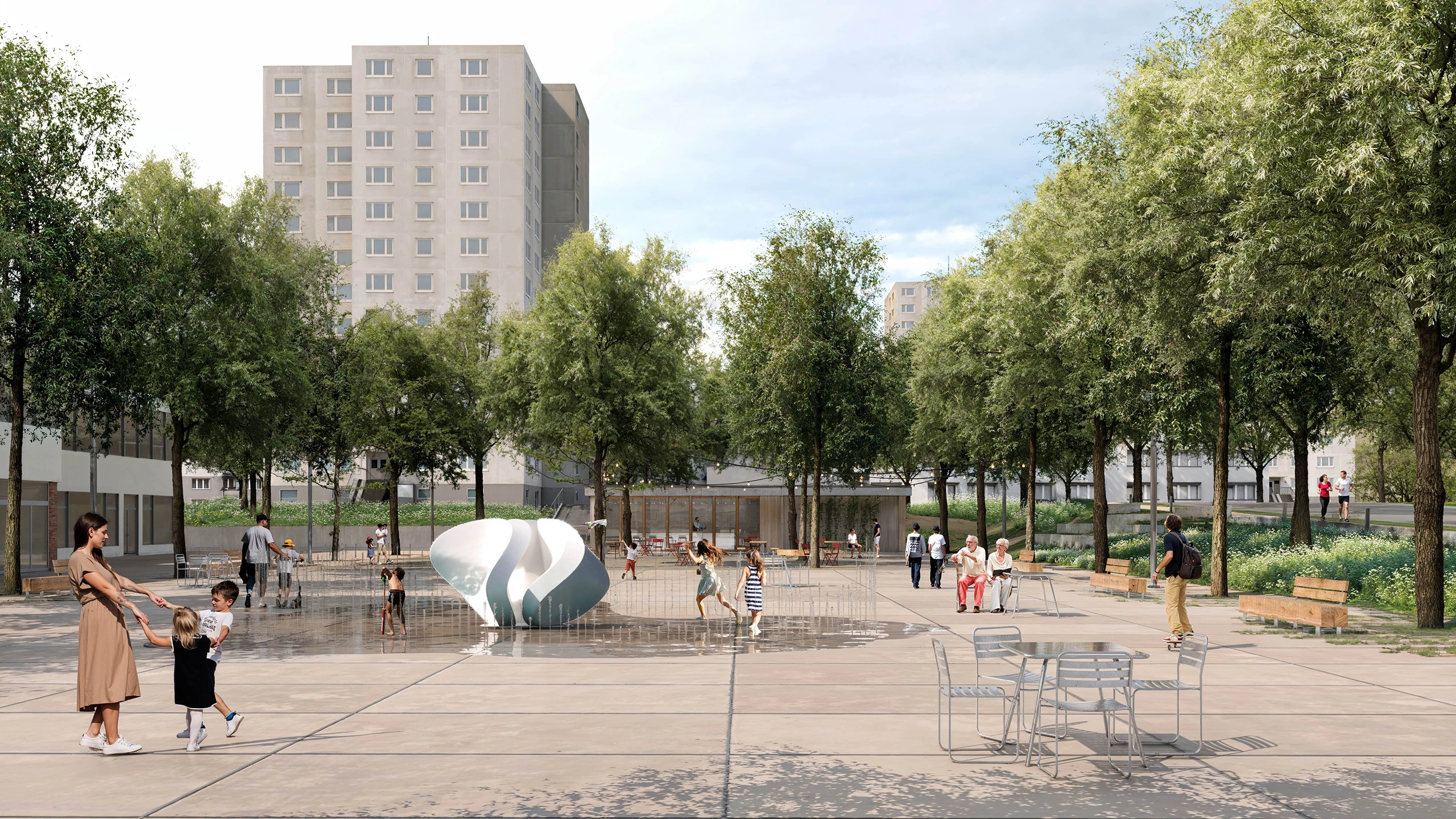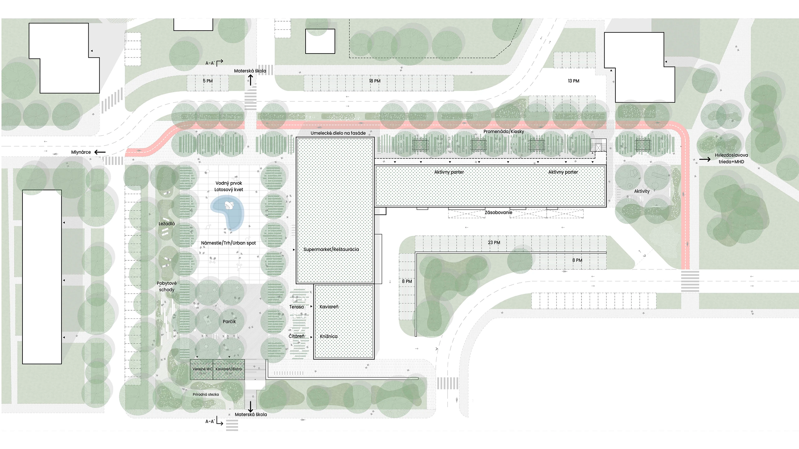 Mierka námestia je zredukovaná na kompaktnejšiu plazu s centrálnym vodným prvkom v podobe lotosového kvetu. Navrhujeme flexibilný priestor, ktorý umožňuje rôzne spôsoby využitia v závislosti od potrieb mesta. Námestie-urban spot-trhovisko plynulo prechádzajú do neformálneho parčíka s pavilónom-bistrom a verejnými toaletami. Svahovitú časť transformujeme na oddychovú zónu s lehátkami a pobytovými schodmi, ktoré zároveň fungujú ako sekundárne hľadisko počas podujatí.
